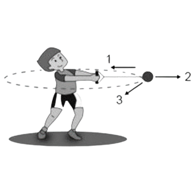 Identifique el vector que corresponde a la velocidad tangencial del martillo que se muestra en la imagen.
