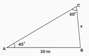 Tres observadores de pájaros se encuentran en los puntos A, B y C, la distancia entre AB es de 30 m y los ángulos de sus visuales se muestran en la figura. Determina la distancia CB. sen 45° = 0.707, sen 60° = 0.866